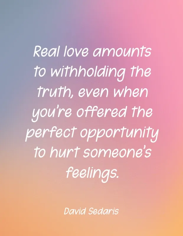 81. Todellinen rakkaus merkitsee totuuden pidättämistä, vaikka sinulle tarjotaan täydellinen mahdollisuus satuttaa jonkun tunteita. - David Sedaris
