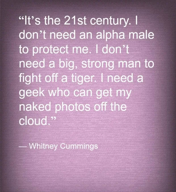 99. Se on 2000 -luvulla. En tarvitse alfa -miestä suojelemaan minua. En tarvitse suurta vahvaa miestä taistelemaan tiikeristä. Tarvitsen geekin, joka voi saada alastomat valokuvani pilvestä. - Whitney Cummings