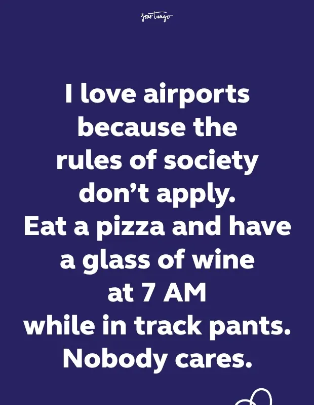 135. Rakastan lentokenttiä, koska yhteiskunnan sääntöjä ei sovelleta. Syö pizza ja sinulla on lasillinen viiniä kello 7 aamulla radan housuissa. Kukaan ei välitä.