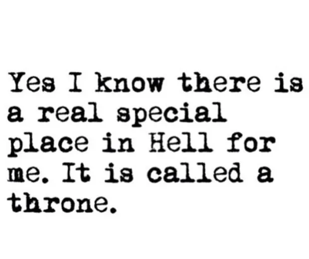 75. 'Kyllä, tiedän, että helvetissä on todellinen erityinen paikka. Sitä kutsutaan valtaistuimeksi. '