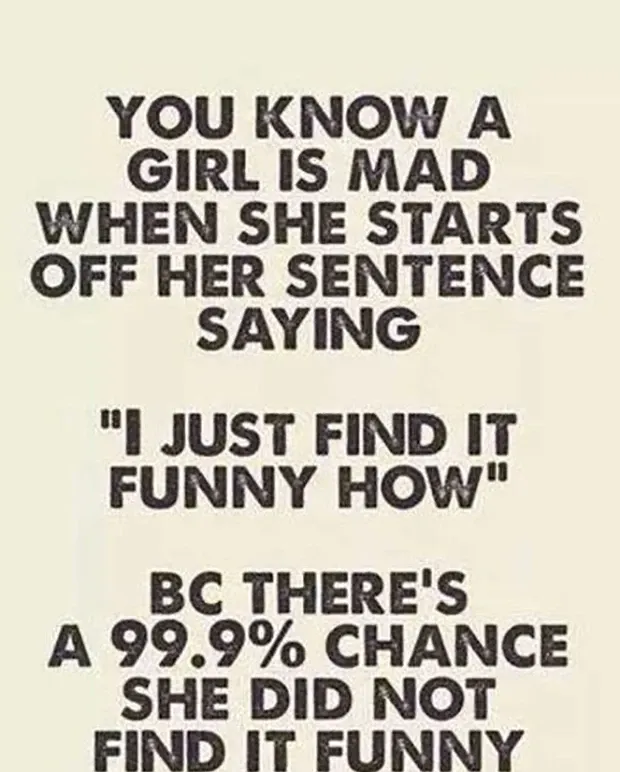 78. Tiedät, että tyttö on vihainen, kun hän aloittaa lauseensa sanomalla Minusta on vain hauska kuinka , koska on 99,9%: n mahdollisuus, että hän ei pitänyt sitä hauskaa.