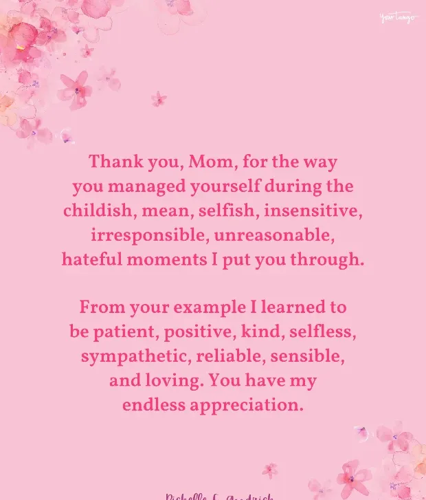 25. Kiitos äidille tavasta, jolla onnistuit itsesi lapsellisen keskimääräisen itsekkään tuntemattoman vastuuttoman kohtuuttoman vihamielisen hetken aikana. Esimerkkistäsi opin olemaan kärsivällinen positiivinen epäitsekäs sympaattinen luotettava järkevä ja rakastava. Sinulla on loputon arvostukseni. - Richelle E. Goodrich