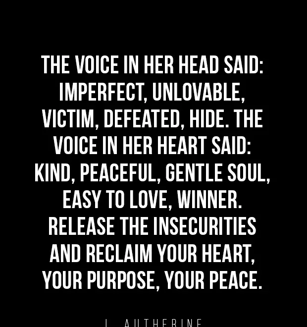 55. Hänen päänsä ääni sanoi: epätäydellinen uhraton uhri voitti piilon. Hänen sydämessään oleva ääni sanoi: ystävällinen rauhallinen lempeä sielu helppo rakastaa voittajaa. Vapauta epävarmuustekijöitä ja ota sydämesi takaisin tarkoituksesi rauhasi. - J. Autherine