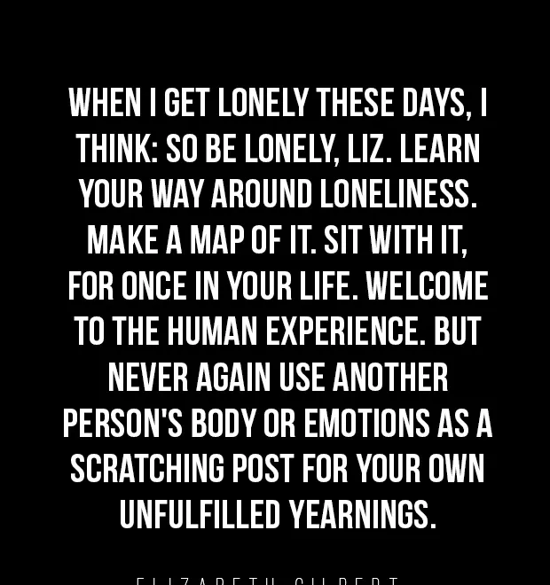60. Kun saan yksinäisenä näinä päivinä, luulen: Joten ole yksinäinen Liz. Opi tiesi yksinäisyyden ympärille. Tee siitä kartta. Istu sen kanssa kerran elämässäsi. Tervetuloa ihmiskokemukseen. Mutta älä koskaan enää käytä toisen ihmisen vartaloa tai tunteita naarmuuntuna omille täyttämättömille kaivoillesi. - Elizabeth Gilbert