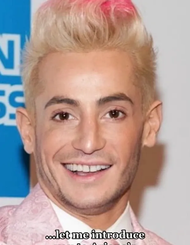 Annan esitellä sinulle Arianan veli Frankie toteaa diaesityksen toisen kuvan tekstin, joka sisältää Frankie -vaaleanpunaisen pukujensa piikkikäs hiusvalkaisut kirkkaan vaaleanpunaisilla vinkillä.