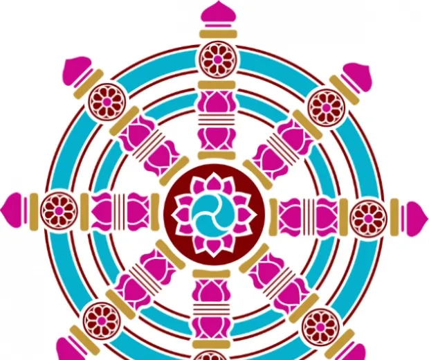 Dharman pyörä tai Dharma -chakra symboloi Buddhaa jakavan tietonsa. Se on kytketty Kahdeksan buddhalaisuuden opetusta ja moraalinen järjestys. Se näyttää vaunun pyörältä, jossa jokainen puhe edustaa 'oikeaa' aikomusta.